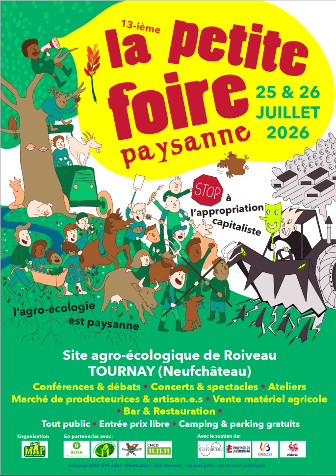 Voici l’appel à toustes les personnes intéressées par la paysannerie et l’agroécologie pour nous rejoindre et nous aider à faire de cette édition un incontournable de l’été. Les BAP sont depuis longtemps investies dans la Petite Foire et cet été encore nous y serons présent·e·s pour partager nos luttes, nos espoirs et nos souvenirs mais aussi des concerts, des conférences, des ateliers, des temps de bronzettes au soleil, des apéros et des rires. Faisons de cette petite foire un véritable festival militant rempli de joies !